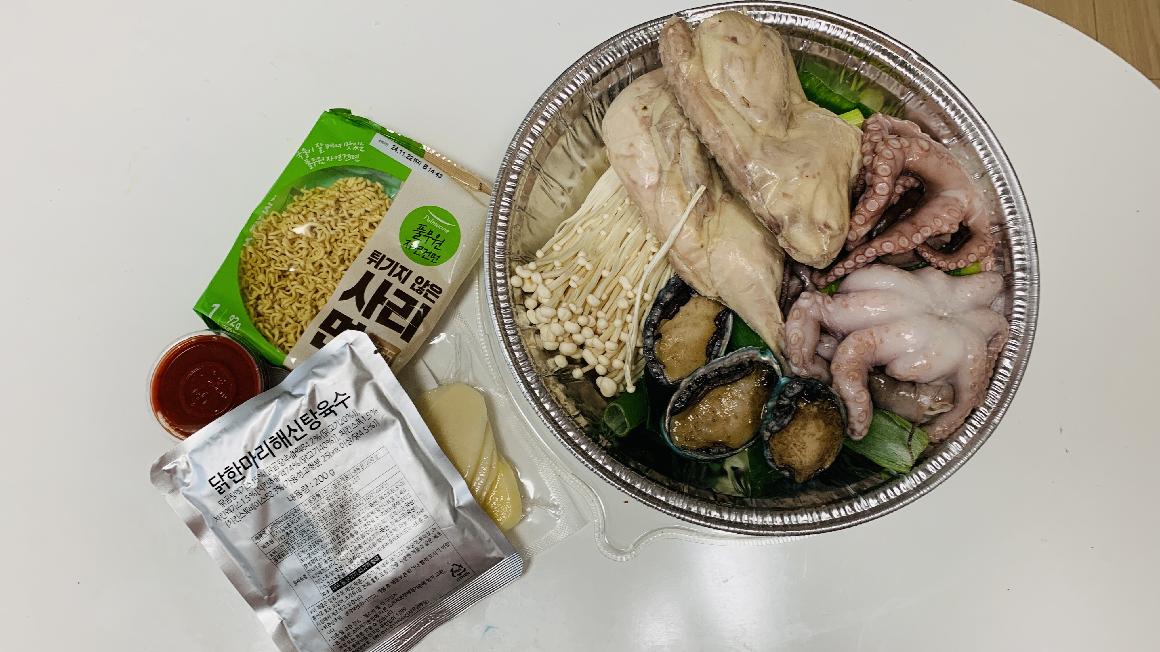 코스트코 닭한마리 해신탕 밀키트는 재료가 신선하구요, 집에서 끓이기만 하면 되서 간편합니다. 밀키트에 들어가는 재료로는 닭고기1, 전복3, 낙지2, 야채(감자,팽이버섯,감자), 면사리, 육수팩, 다대기가 들어가 있습니다.